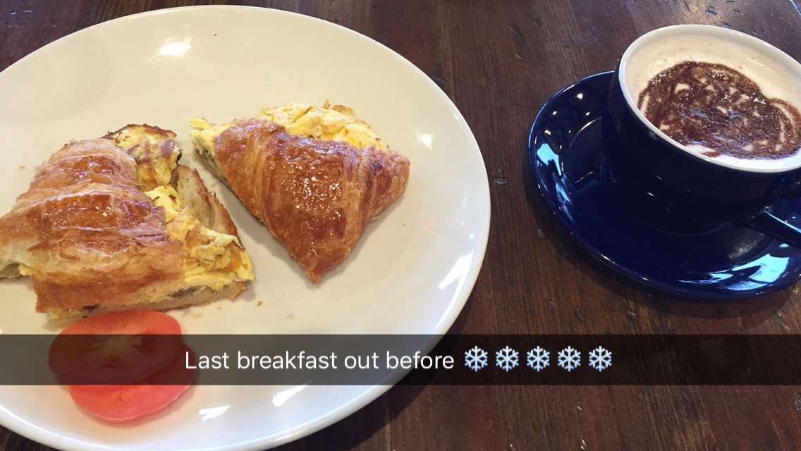 ~Grabbing breakfast with my friend Friday morning at La Madeleine before the snow